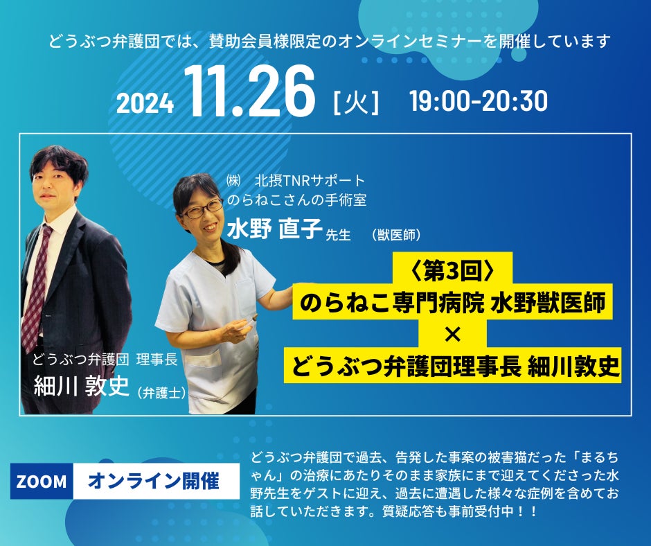 【NPO法人どうぶつ弁護団】2024.11.26(火)第3回賛助会員向けオンラインセミナーのご案内 ゲスト:のらねこさんの手術室 水野獣医師